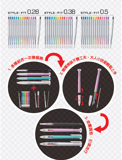 接下來是UNI的STYLE-FIT開心筆,UNI的這系列多色筆在台灣的文具市場應該也出現有一年多了,他們的筆管市面上有單色、三色、五色等三種筆管,單色筆管為15元、三色筆管45元,五色筆管75元,原子筆筆芯主要則區分為0.28、0.38、0.5等三大系列,個別有十六種顏色(紅、粉紅、赤紫、淡粉紅、橘、柑橘、金黃、萊姆綠、綠、紫、天空藍、淡藍、藍、深藍、深茶、黑),筆芯的平均價位與PILOT的變芯筆一樣,在25元左右,同樣也有出自動筆筆芯,但我只有看到0.5的自動筆筆芯,價格則稍貴一些在55元左右。